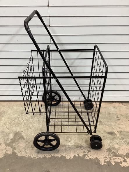 Folding Shopping Cart with Swiveling Wheels and Dual Storage Baskets.