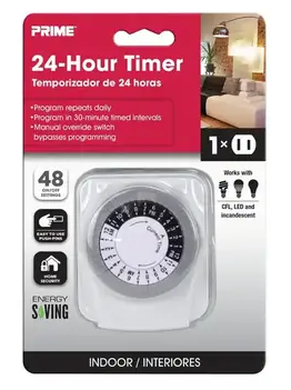 Prime TNI2412-RC 24-Hour Indoor Mechanical Timer, 125V, White – Energy-Saving Plug-In Outlet Timer