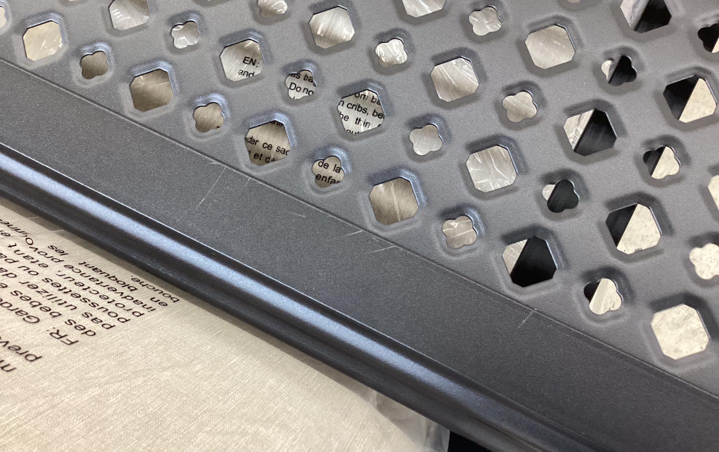 Rectangular dining tabletop with a beautiful, stamped pattern provides a stunning visual appeal