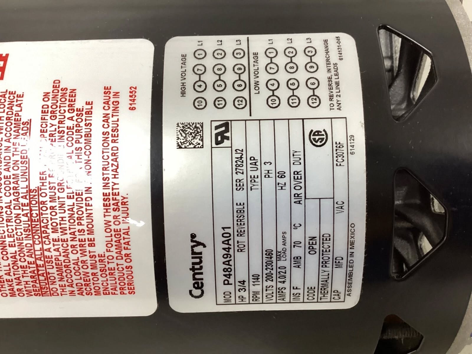 CENTURY FC3076F Condenser Fan Motor: Band Mount, Open Air-Over, 3/4 HP