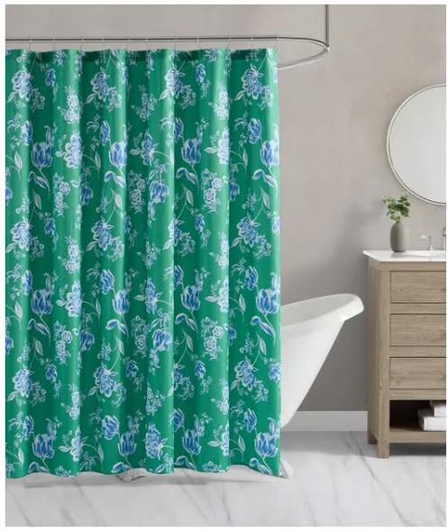 Set includes a shower curtain (72" x 72"), soap dispenser, tumbler, and 12 hooks