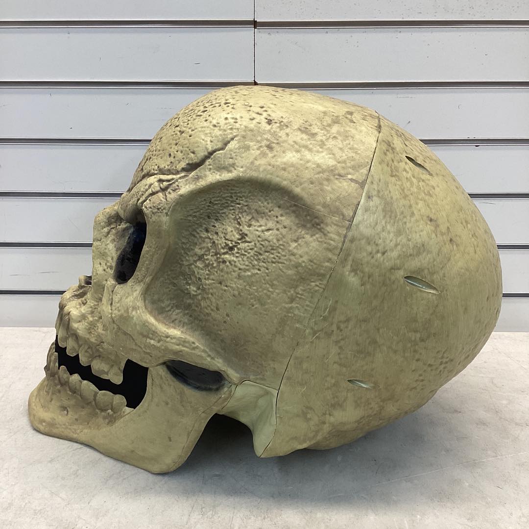 Home Accents Skelly Scary Head with LCD LifeEyes Accessory Replacement. This animated skeleton head by Home Accents Holiday features a spooky design with off-white color and antique style. It comes with a remote control for easy operation and measures 16 inches in height with a width of 11.8 inches and a depth of 18 inches.