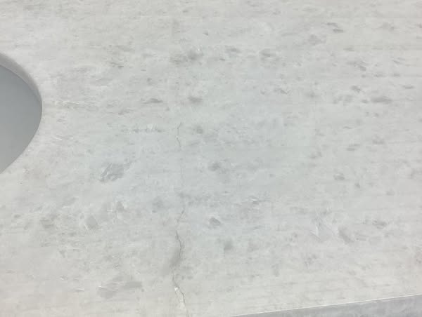 Crack in left sink and on marble top. Chip on front left corner. See pictures.