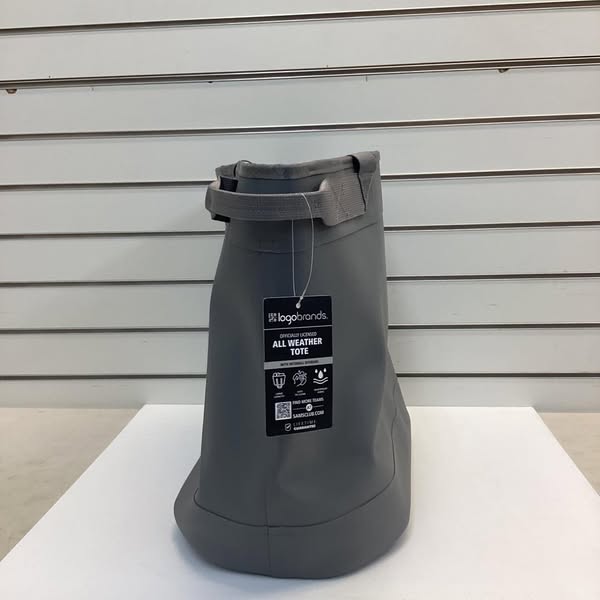 Officially licensed all weather tote that has a rubber grip on bottom and open upright design with flexible swivel handles