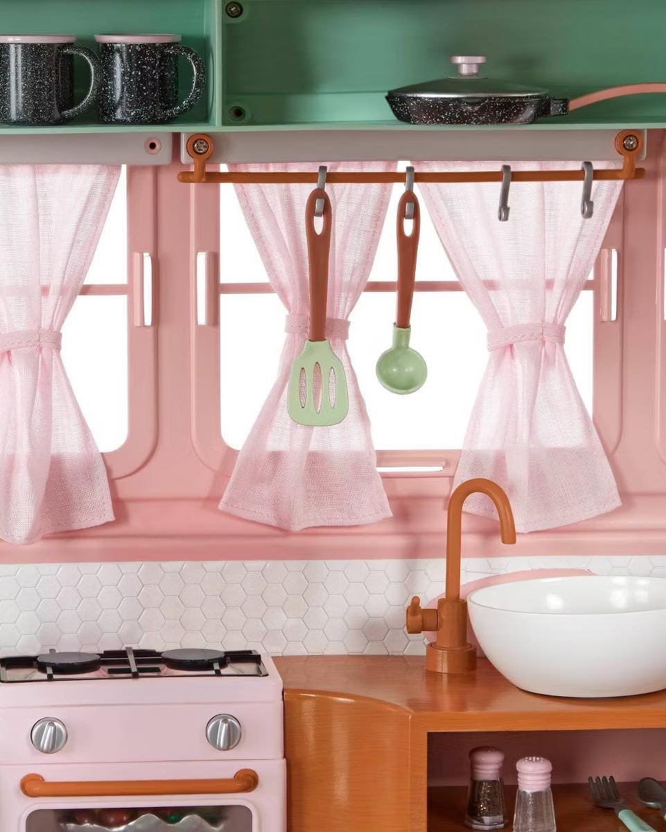 Lots of Storage Space: convenient shelves, counters, and a hook let kids neatly display and organize their accessories as they load the camper.