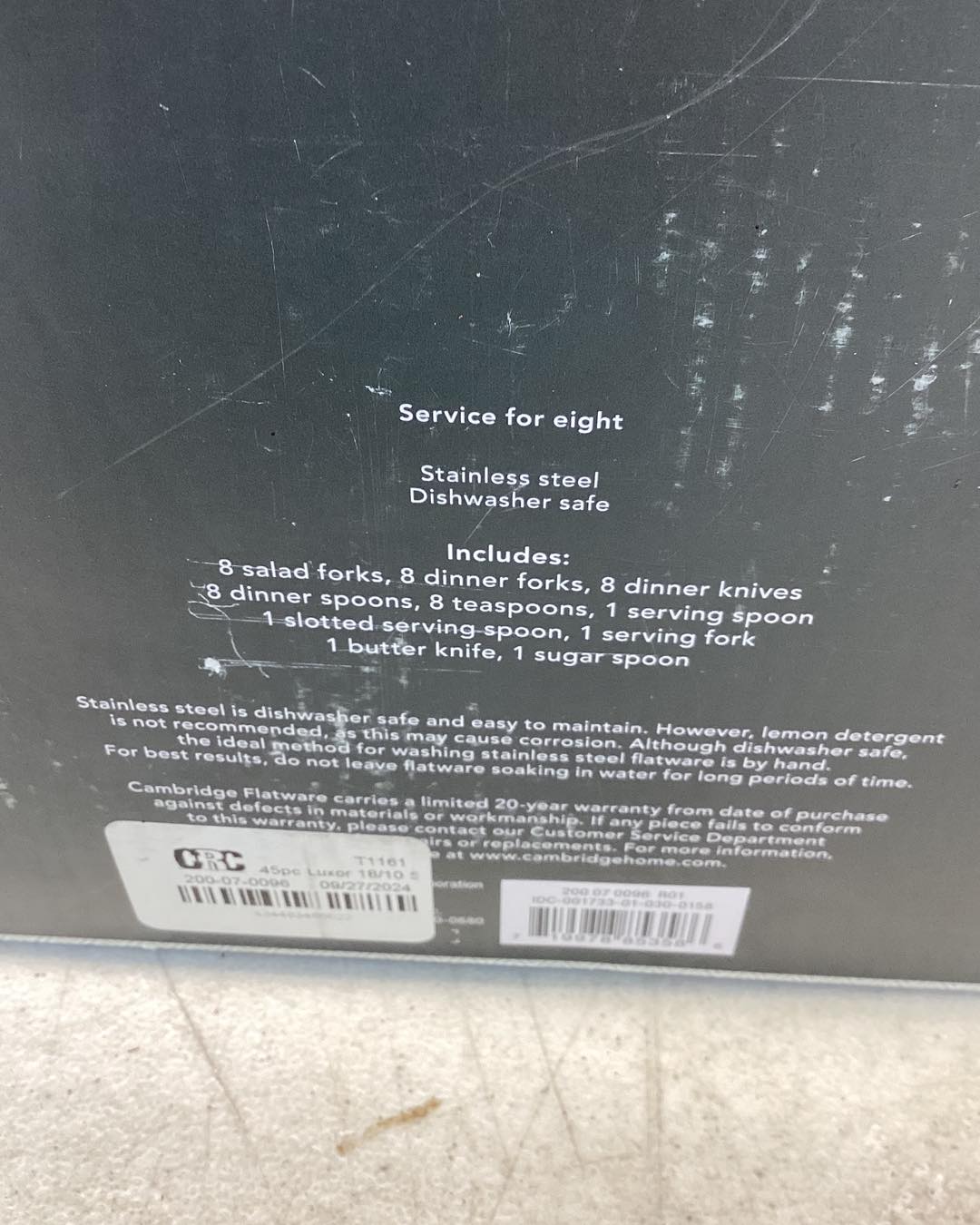 Give your party table spread a touch of classic elegance and luster with this 45-Piece Luxor 18/10 Stainless Steel Flatware Set from Threshold Signature™. Made from 18/10 stainless steel with a smooth silver finish and rounded, oval handles, this flatware set is great for entertaining as well as everyday use. The 45-piece tableware set includes service for eight people, comprising dinner forks, salad forks, dinner spoons, dinner knives, teaspoons, and one each of a butter knife, sugar spoon, serving fork, slotted spoon, and serving spoon. Plus, each piece is dishwasher safe for easy cleaning