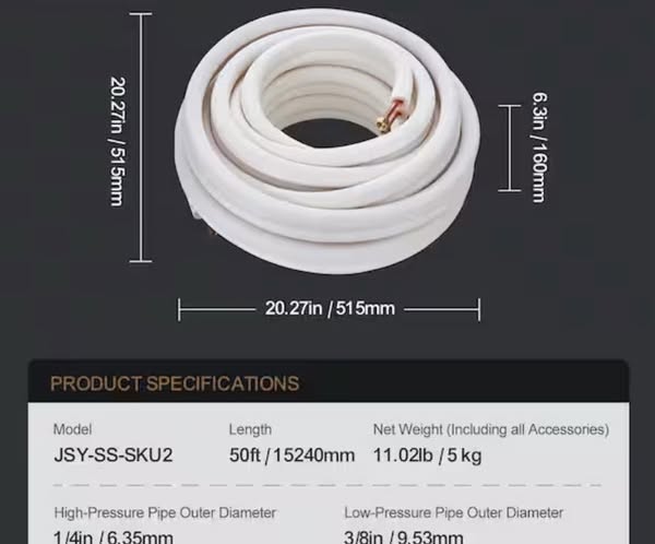 VEVOR 50 ft. Mini Split Line Set 1/4 in. 3/8 in. O.D Copper Pipes Tubing and Triple-Layer Insulation for Air Conditioning